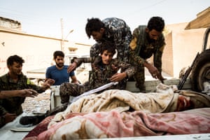 At a medical centre, two Yazidi girls from Iraq – in their late teens, but looking much older – hosed and swept a courtyard where the two dead fighters had been brought a few hours earlier. Their four wounded colleagues squatted nearby. “I swear we didn’t even see them,” said one wide-eyed boy from Raqqa with a bandaged head. His colleague clasped his hands over his damaged ears.